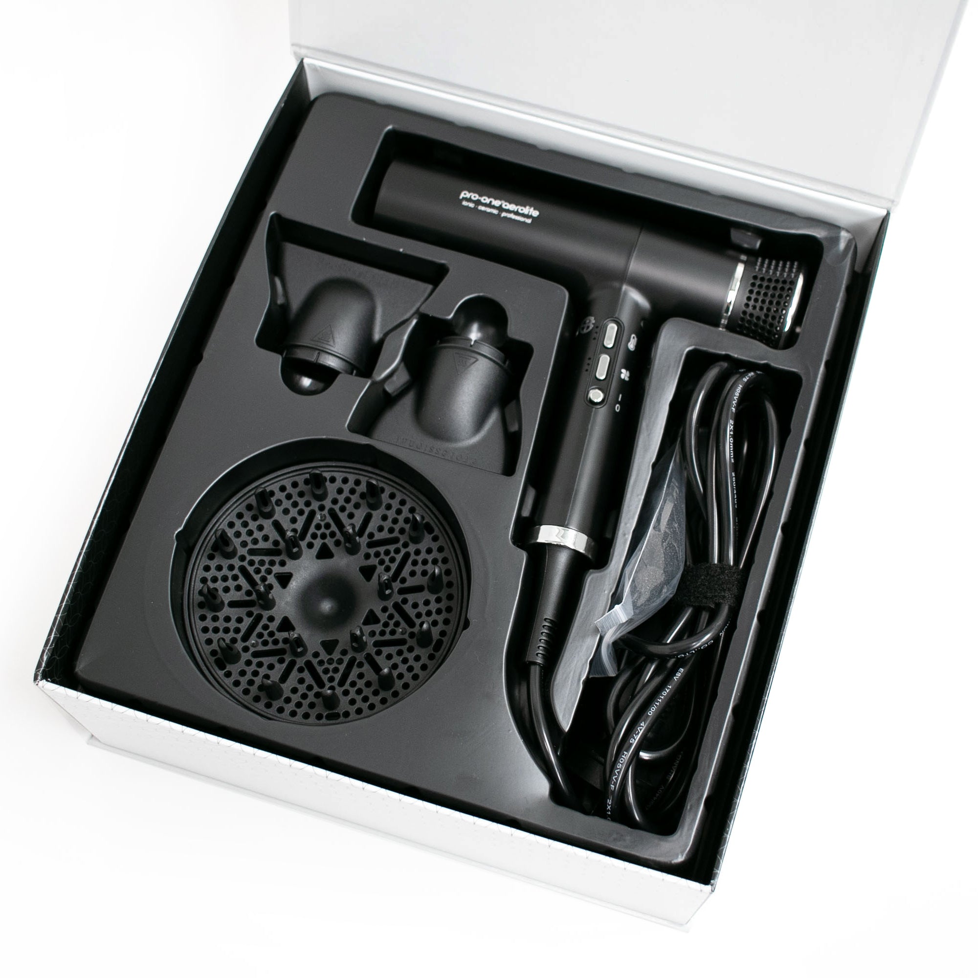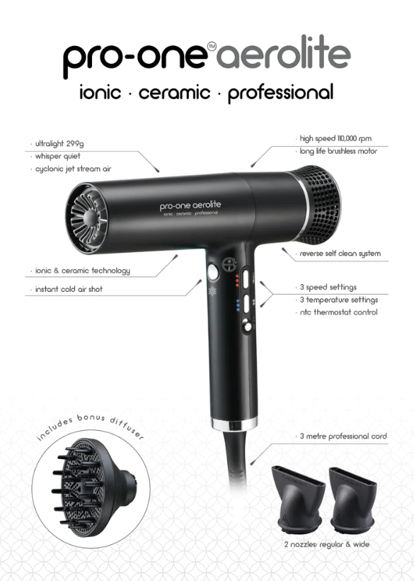 The new Pro One Aerolite is the ultimate upgrade to your hair styling routine! Not only is this small blow dryer extremely lightweight, but it has been engineered with one of the most expensive and advanced motors in the market. The BLDC (Brushless Direct Current) Motor spins 20 x faster (110,000 RPM) than traditional hair dryers and dries your hair in less than half the time. It is also relatively quiet when compared to hair dryers on the market now.